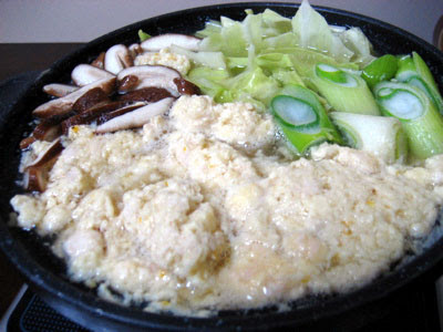 鶏団子は、いつものように皮を剥いだ鶏の胸肉を包丁で細かく刻んで叩いて、刻んだ柚子の皮と水切りした豆腐と擦った長芋にタマゴを混ぜて、酒、岩塩で味つけをして繋ぎに片栗粉を入れる。